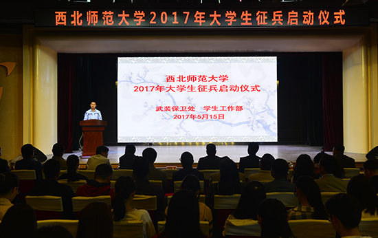 5月15日,学校2017年大学生征兵启动仪式在学生发展中心举行。安宁区人民武装部政委王耀堂上校和学校相关职能部门负责人,各学院党委副书记、辅导员,各年级学生代表共300余人参加启动仪式。