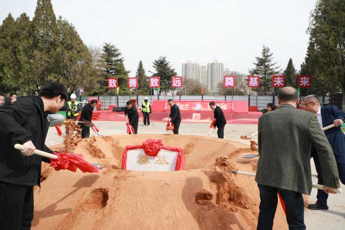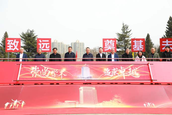活动中,与会嘉宾、师生代表共同启动项目开工并为大楼培土奠基。