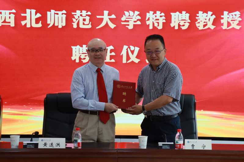 黄违洪教授衷心感谢西北师大的信任与支持。他表示,西北师大办学历史悠久、学术氛围浓厚,是干事创业的好平台。受聘特聘教授,既有荣誉感又倍感压力与责任,期待和西北师大同仁一起,提升办学水平、促进学术交流营造学术氛围等方面做出自己的贡献。